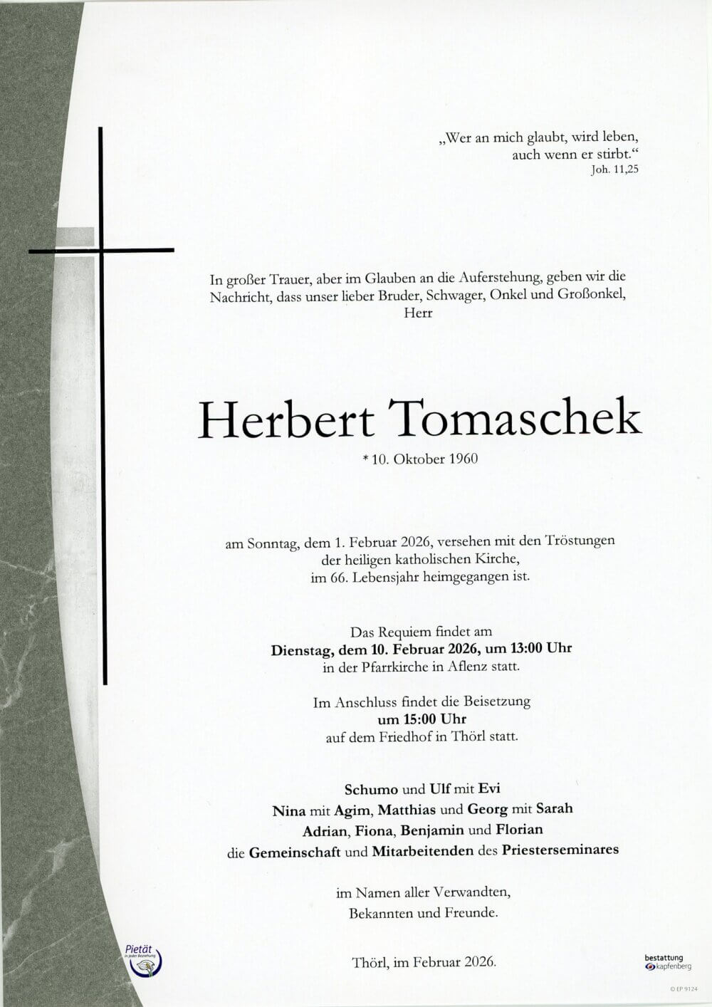 Die Katholisch-Theologische Fakultät trauert um ihren Studenten der Theologie, Herbert Tomaschek, der am Sonntagabend nach kurzer Krankheit gestorben ist. Unser Mitgefühl gilt besonders seiner Familie und der Gemeinschaft des Priesterseminars.