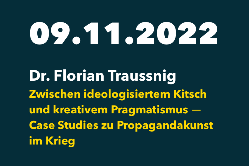 Doch nicht nur Diktaturen setzen im Krieg auf Propagandakunst: Studiert man etwa britische Flugblätter des Ersten Weltkriegs oder jüngere Youtube-Clips von westlichen Regierung(sinstitution)en, zeigt sich: auch Demokratien sind im Kriegsfall propagandistisches Pathos und die interessensgeleitete Verzerrung von Fakten nicht fremd. In zahlreichen Fällen jedoch gelang und gelingt den in letzteren persuasiv arbeitenden Künstlerinnen und Künstlern der Spagat zwischen pragmatischem Handlungsrahmen und ästhetischem Anspruch erstaunlich gut. Mit kriegspropagandistischen und -biografischen Fallbeispielen des 20. und 21. Jahrhunderts wird der Historiker und KULTUM-Diskurskurator Florian Traussnig daher die Widersprüche, Ambivalenzen, aber auch unerwartet kreativen Potentiale von Propagandakunst im Krieg ausleuchten.