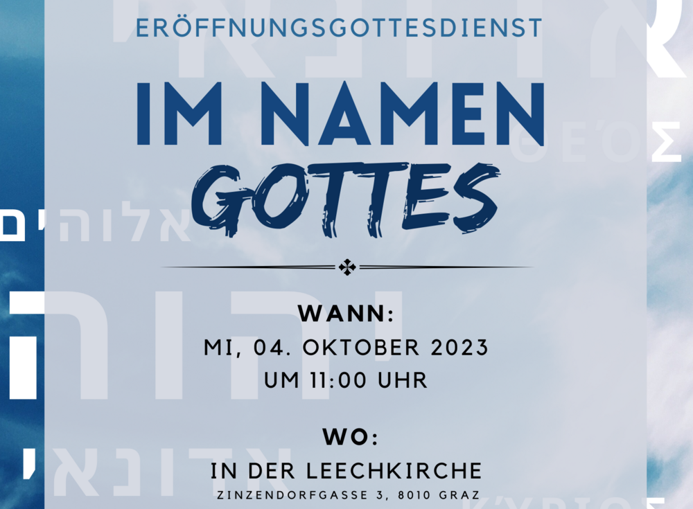 "Im Namen Gottes" möchten wir gemeinsam mit allen Mitarbeiter:innen und Studierenden der Kath.-Theol. Fakultät mit einem Eröffnungsgottesdienst, zelebriert von unserem Diözesanbischof Wilhelm Krautwaschl, in das neue Studienjahr starten - dazu laden wir herzlich in die Leechkirche am 4. Oktober um 11 Uhr ein.