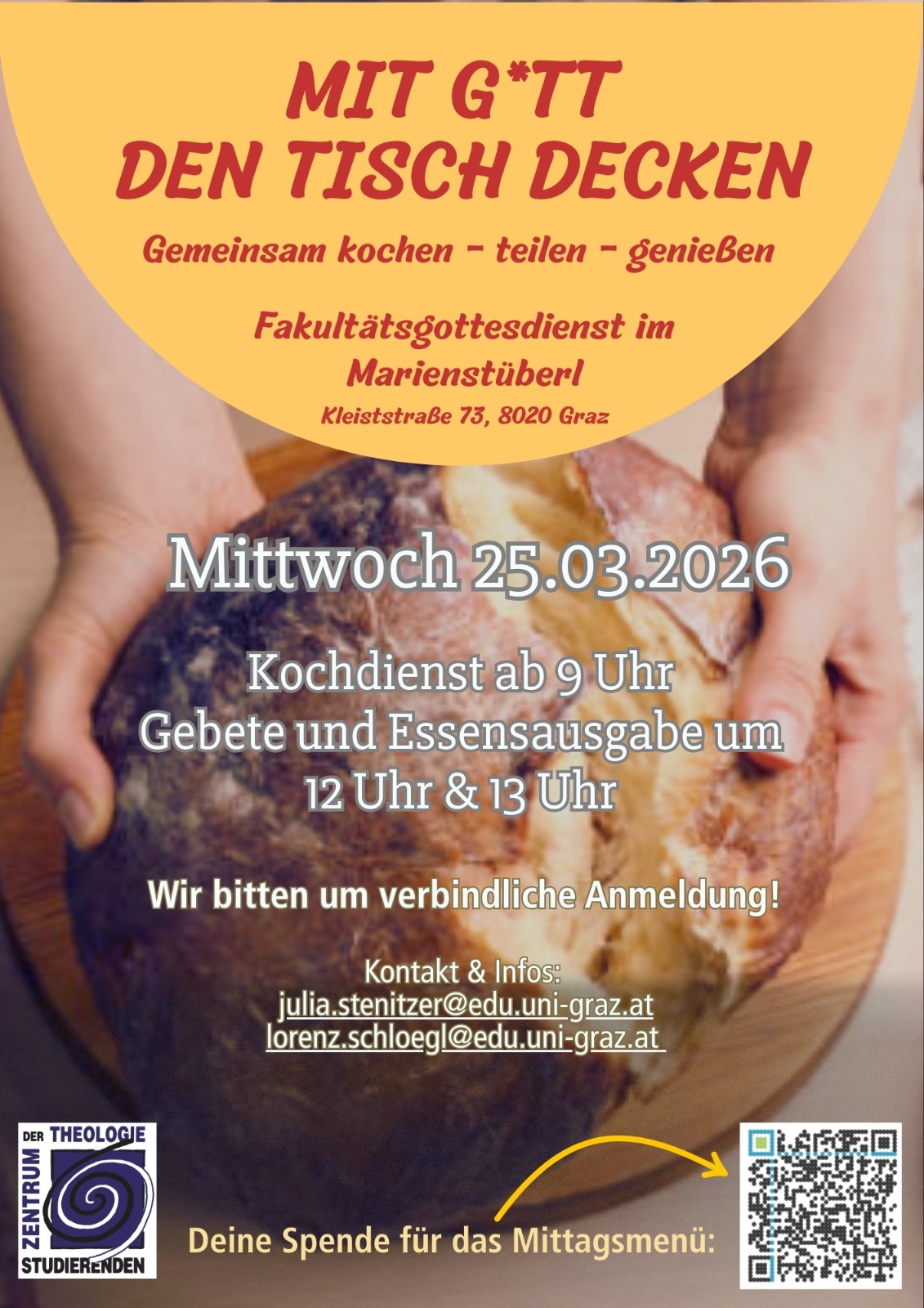 Gerne nehmen wir Deine Spende für das Mittagsmenü entgegen! Dazu der QR-Code auf dem FLYER.